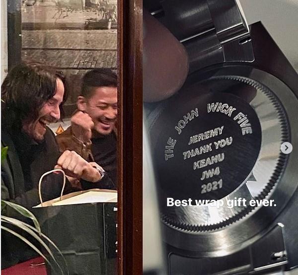 Развернув подарочную упаковку, Брюс, Джереми, Дэйв и Ли обнаружили часовые коробки Rolex, а в коробках — одинаковые модели Rolex Submariner с индивидуальными памятными гравировками на задних крышках («Спасибо «имя» от Киану JW4 2021»). Такую же модель Ривз приобрел и для себя, поэтому на каждых часах есть гравировка The John Wick Five (пятерка Джона Уика). Команда каскадеров уже поделилась своими впечатлениями в Instagram (Социальная сеть признана экстремистской и запрещена на территории Российской Федерации), назвав это «лучшим подарком по окончании съемок за всю жизнь».