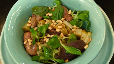 Теплый салат с куриной печенью и карамелизированной грушей. Куриный рулет