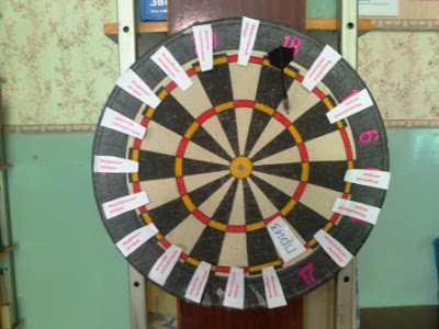 Правила игры: В игре принимают участие 2 команды. Каждая команда по очереди выбирает уровень вопроса и сколько очков разыгрывается (кидая дротик в мишень). Чем больше очков, тем сложнее вопрос. Право ответа у той команды, которая первой подаст сигнал готовности к ответу – дружные хлопки. Если ответ будет неверным, то право ответа переходит к команде, подавшей сигнал второй. Итоги подводятся по количеству общих очков.