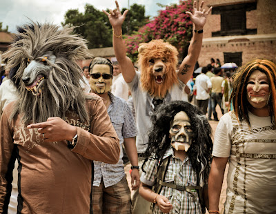 Интересна история происхождения такого вот празднования. Когда-то у одного непальского короля умер сын. Его жена была неутешна, выплакала все глаза и забыла, как улыбаться. В день Гай Джатра король приказал всем семьям, у кого умерли близкие, собраться в процессию и пройти перед окнами королевы, чтобы она увидела, что не только с ней случилось такое горе, что таких людей много. Однако это не помогло. Тогда король назначил награду тому, кто рассмешит королеву, любым способом. Ну вот и начал тут народ изощряться: шутки-прибаутки-розыгрыши, маски-костюмы-переодевания. И рассмешили таки королеву.